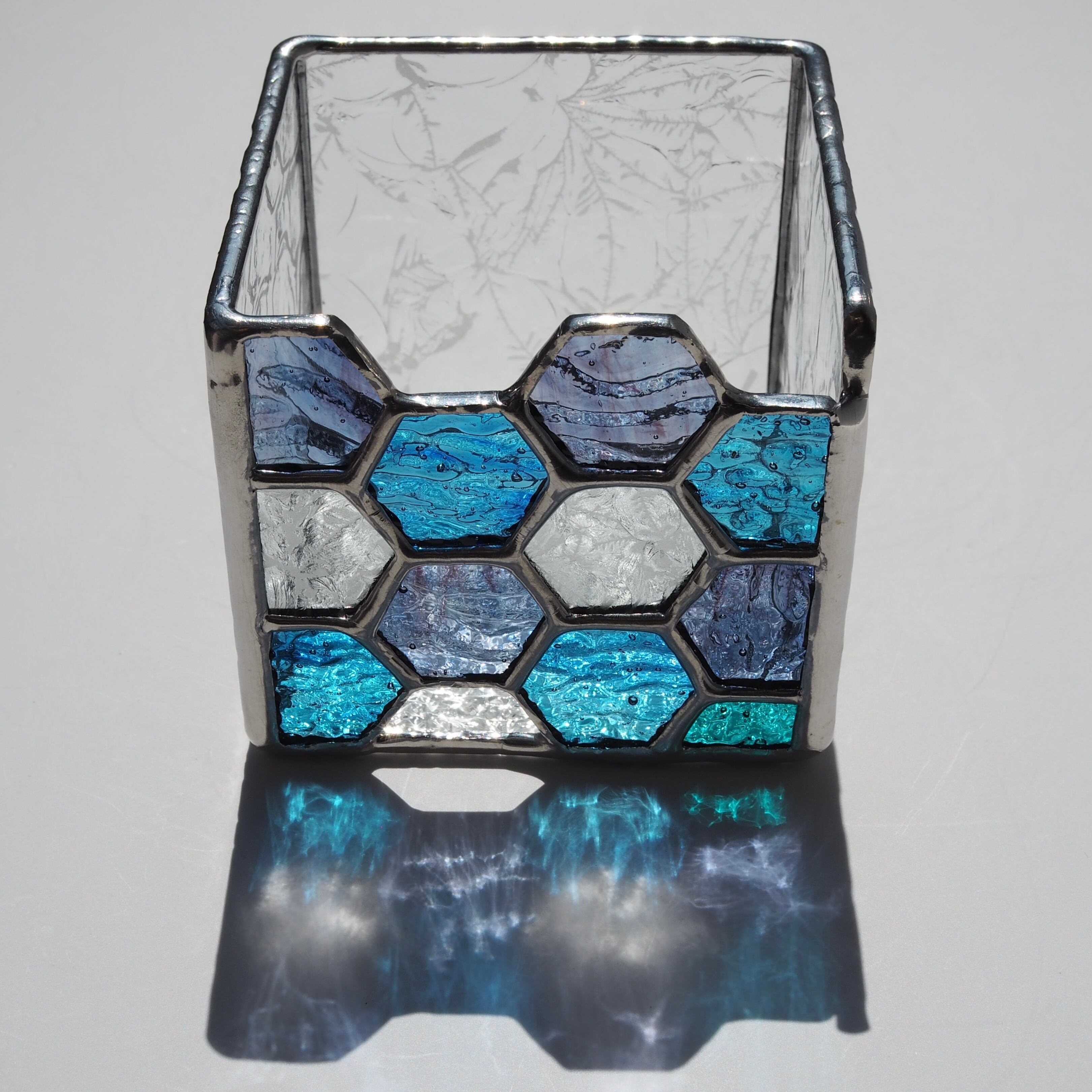 六角形のガラスピースを組み合わせた、ハチの巣模様が印象的なキャンドルホルダー。