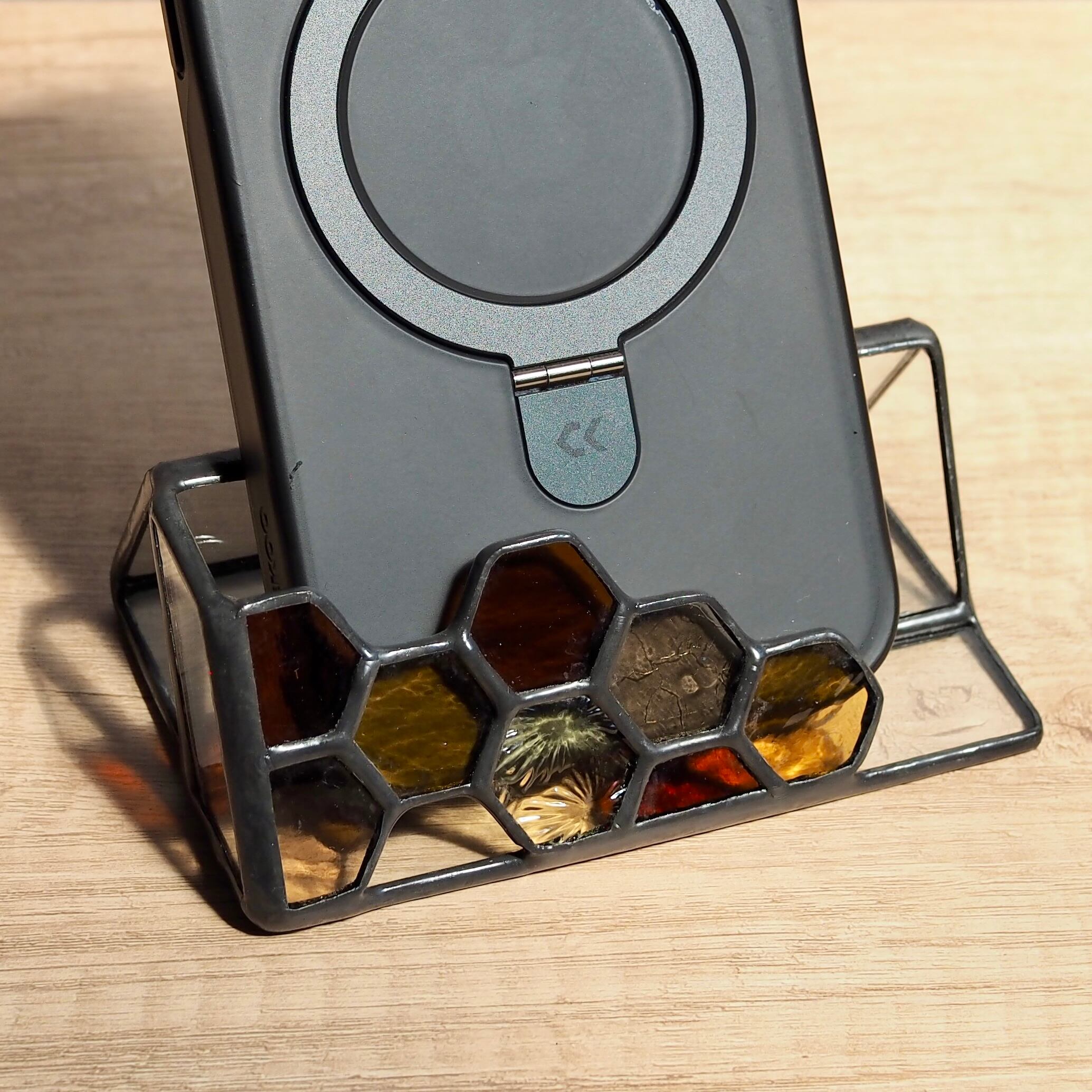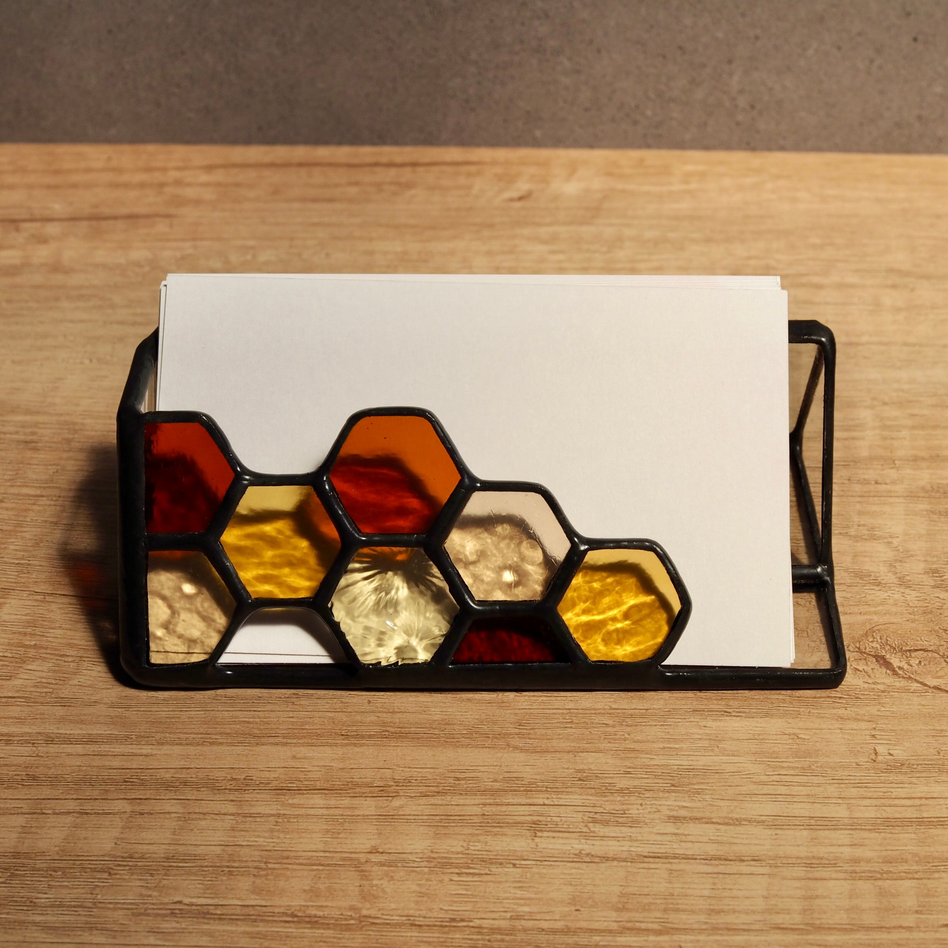 ハチの巣模様が特徴のステンドグラス製カードスタンド。