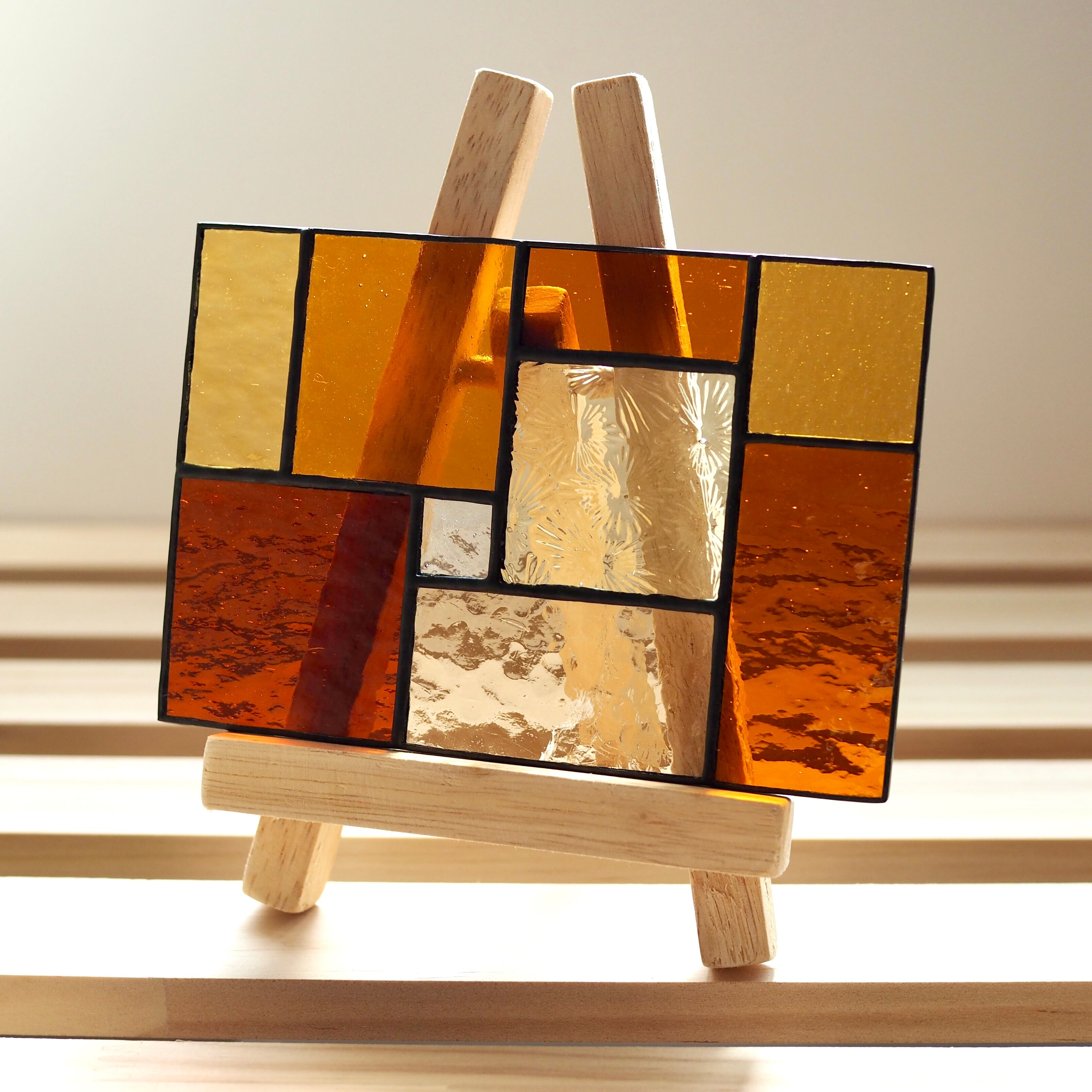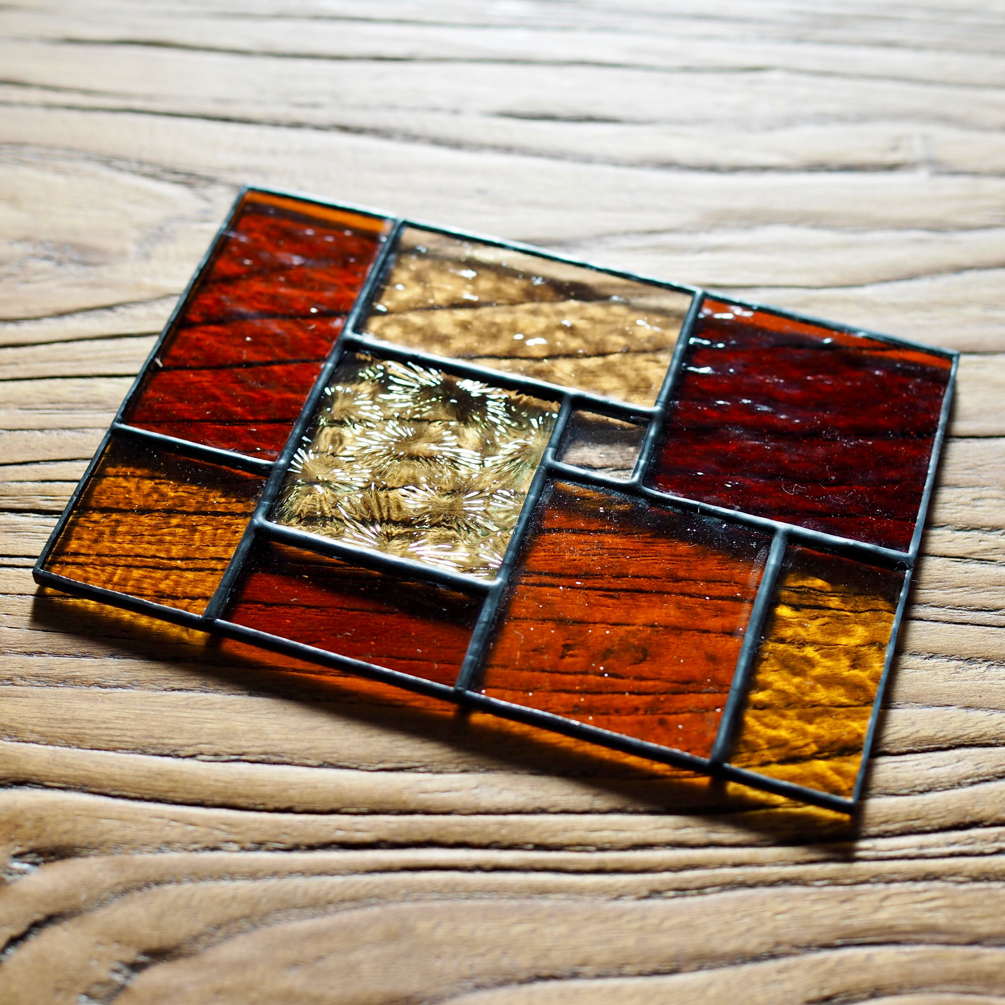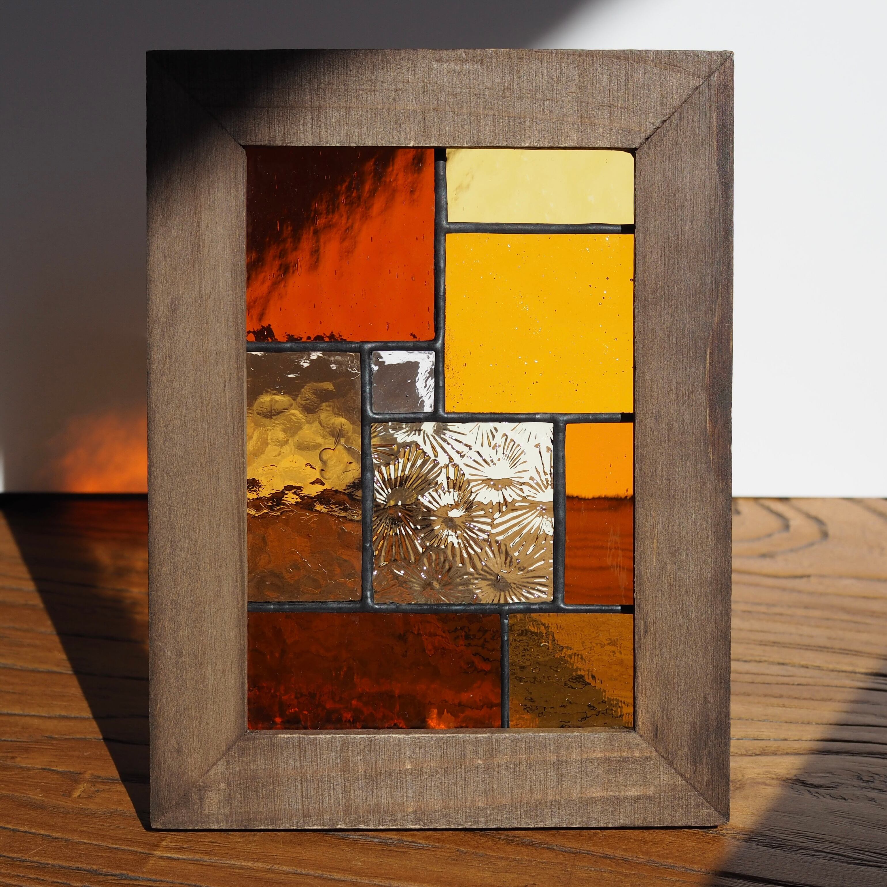 深みのあるオレンジや琥珀色など9種類のガラスを組み合わせ、あたたかく落ち着いた印象に仕上げました。